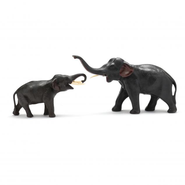 Good estate condition; felt pads to underside of feet; both elephants with one tusk glued to body.