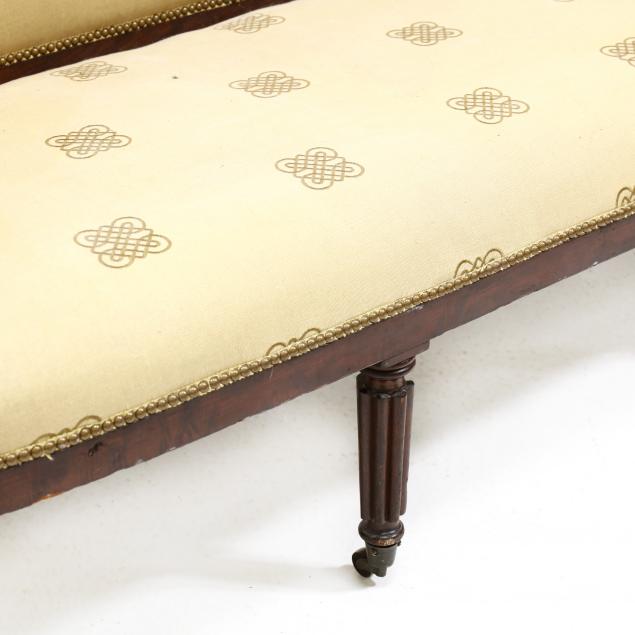 Circa 1820, arched fluted crest rail, button finials, scrolled reeded arms, woven holden upholstery with brass nail head trim, eight bold reeded legs, brass casters.