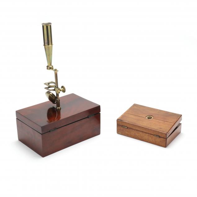 Private Collection of an Antiquarian, Charlotte, North Carolina Smaller case with cracks to lid and without key, apparatus will mount to lid, some silver loss to smaller set's mirror; larger case with some looseness as hinges; larger microscope's mirror sits slight askew beneath stage. Some spotting to brass and handling wear on both instruments.