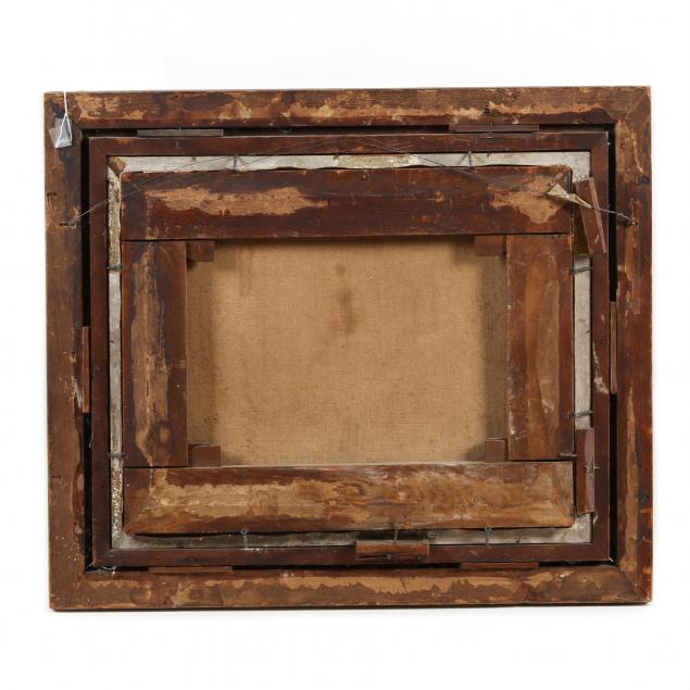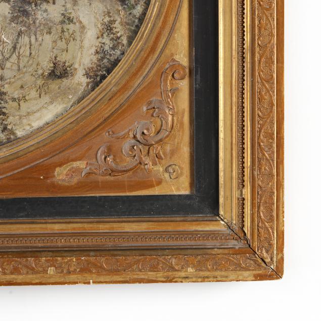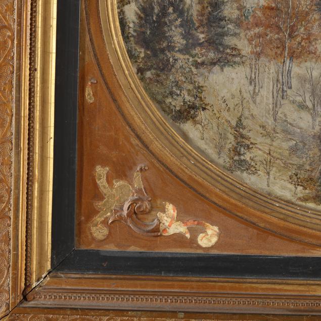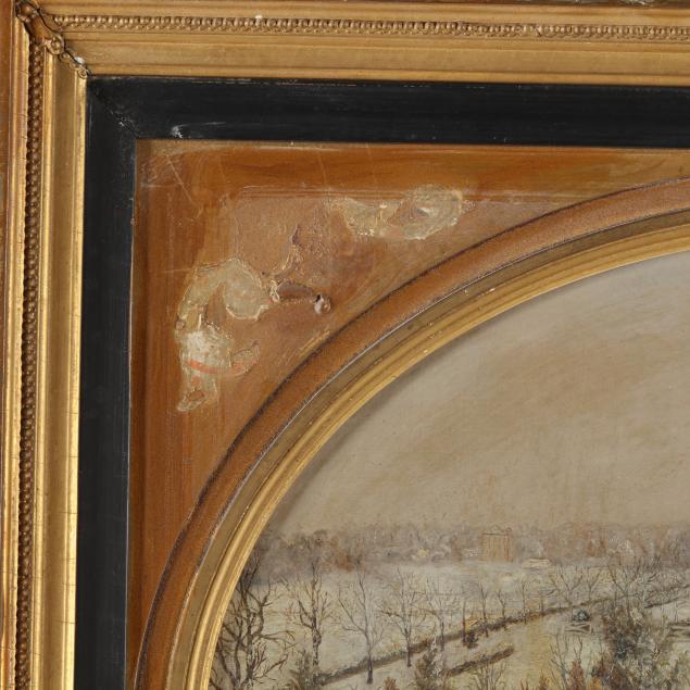 Extensive loss to composition ornament on spandrels; scattered chipping to frame; surface grime; some paint loss and flaking to lower edge of canvas.