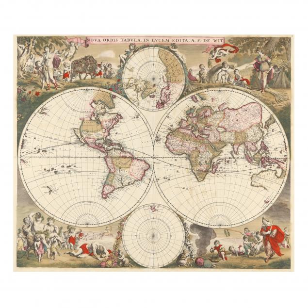(Amsterdam, 1670), copperplate engraving with hand color; depicts double-hemisphere maps with the poles above and below; vignettes in each corner represent the four seasons and elements; presented in wooden frame with gilt liner (overall 32 x 29-1/2 in.).