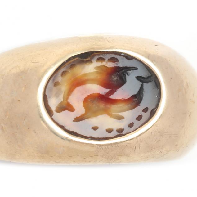 The agate inset depicts two inverted dolphins, approximate ring size 10-1/2, testing 14K.