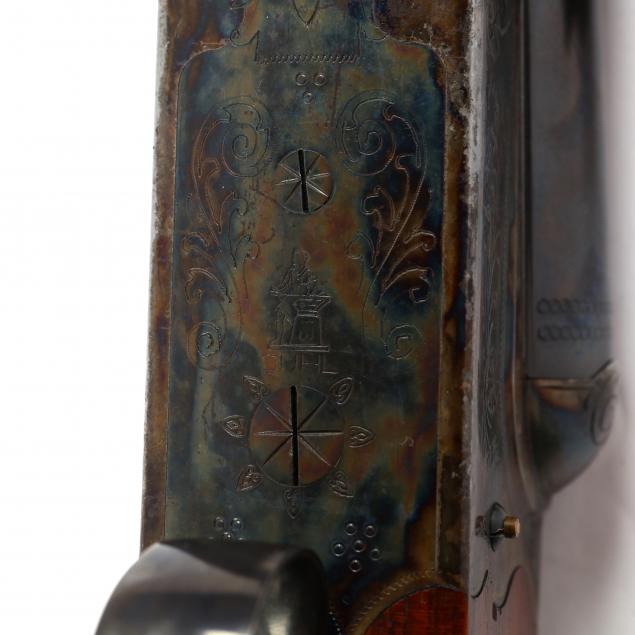 Serial number 380015 on the water table, and barrel hinge, double triggers, 28 in blued barrels marked GEBR MERKEL SUHL, engraved cased hardened receiver, checkered walnut stock and forend, butt plated extension, left barrel IM and right barrel M, LOP 15 in. Will require FFL transfer.