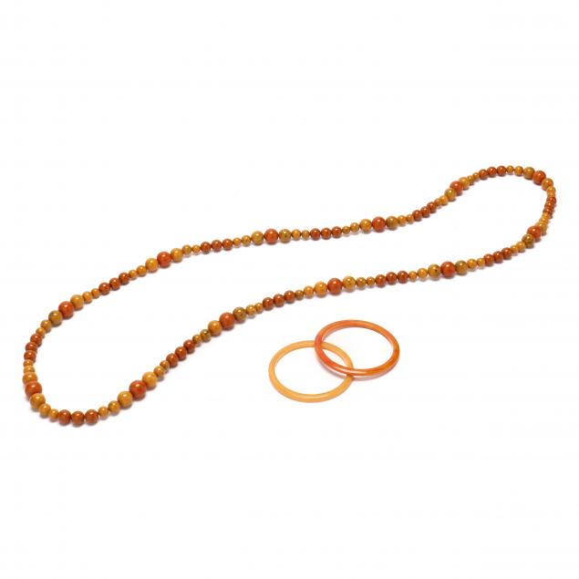 To include: a butterscotch bakelite endless necklace of graduated beads, no clasp (26 in. or 52 in.of beads); two bracelets; a choker with slide clasp (18 in.); a necklace of graduated beads (12 in.)