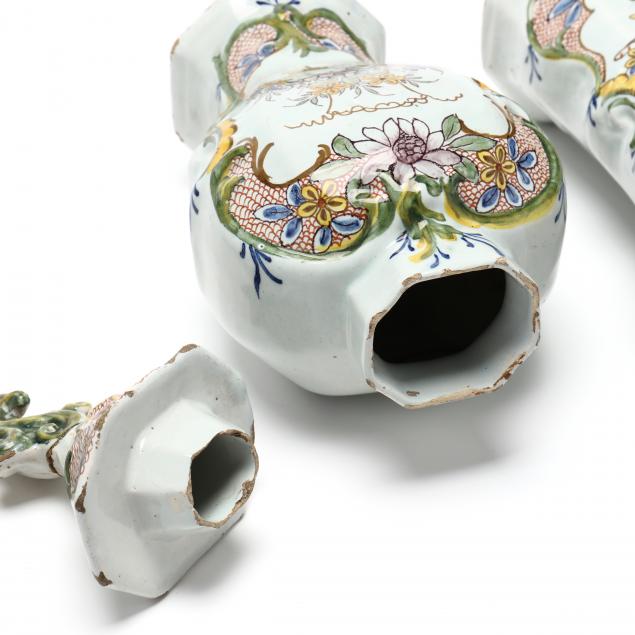 Second half 18th century, likely 1780, the set includes two beaker vases (8 3/4 in.) and three baluster vases with covers (HOA 12 1/2 in.), painted on the front in five colors with a lush bouquet within a molded cartouche, the covers similarly decorated, the reverse painted with a branch. All unsigned.