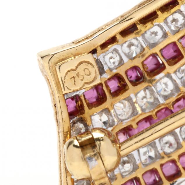The waving flag with calibre cut sapphires to the canton ground and with star set diamond melee, the stripes with bead set full cut round diamonds and channel set calibre cut rubies, the pole with bead set full cut round diamonds and the finial with a bezel set diamond accent, with locking pin stem and hinged bail for pendant wear, stamped 750. Total diamond weight approximately 1.25 total carats (F-G color, VS2-SI2 clarity).