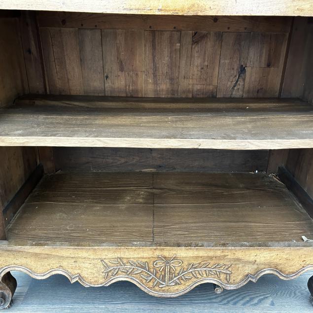 Mid-18th century, three part form, applied pronounced cove molded cornice above a relief carved frieze with central rosette, each horizontal panel with fern leaf above two large steel hinged cabinet doors with double asymmetrical raised panels set within relief carved moldings, relief carved center stile, paneled rounded corners with upper repeating carved fern motif, double raised panel side panels, shelved interior with two drawers, the base with two hinged cabinet doors with repeating motifs, shelved interior, boldly scalloped skirt again with relief carved fern and central ribbon, short cabriole legs with whorl front feet.