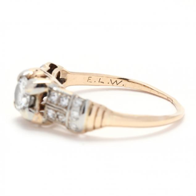 Centering on a transitional cut diamond weighing approximately .35 carat (I color, SI1 clarity), and single cut diamond accents weighing approximately .21 total carat (H-I color, SI1-I1 clarity), stamped 14K - 18K with maker's mark MS and engraved with initials E.L.W.