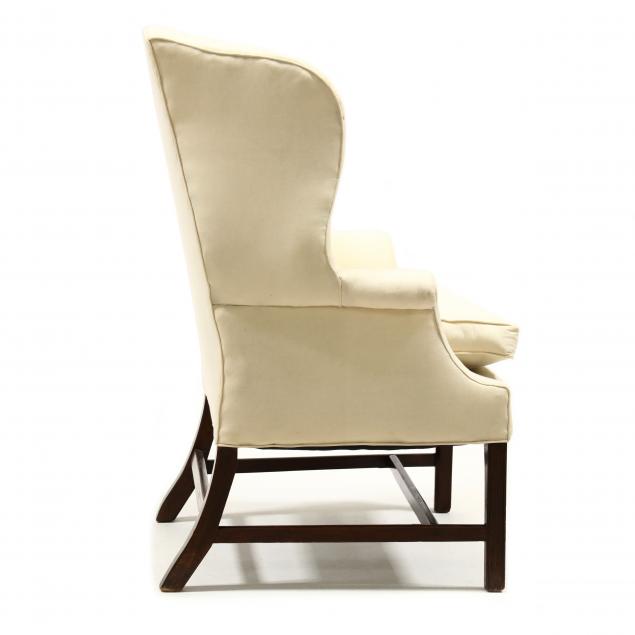 Late 18th century, well developed frame, loose cushion, straight molded front legs, dovetailed stretcher, rear down-swept legs.