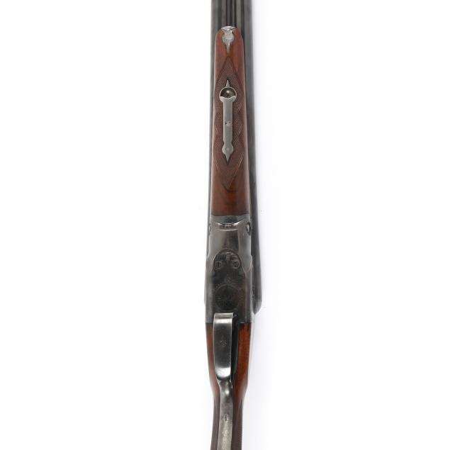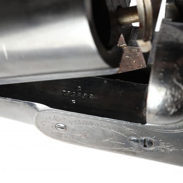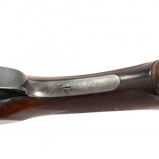 Serial number 134636 found on the trigger guard tang, under the forend, barrel hinge, and on the water table, double triggers, 28 in. blued barrels have no maker marks, left barrel marked FULL and right barrel marked IMP-MOD, receiver engraved PARKER BROS on each side, flying ducks on the left, quail on the right, and pheasant underneath, checkered walnut forend and stock, recoil pad added. LOP 14 in. Will require FFL transfer.