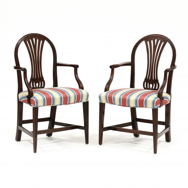 Circa 1800, molded crest and stiles, pierced back splat, molded shoe, shaped arms with knuckles, molded and shaped arm support, over upholstered seat, serpentine front seat rail, molded and tapered front legs, stretcher base, down-swept rear legs.