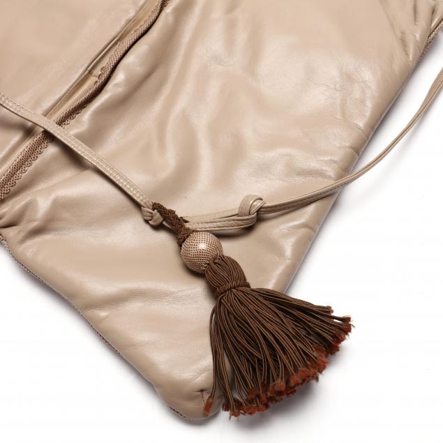 Two Colombetti of Milan python snakeskin ruched bags, 1980s-90s, with tuck-away shoulder straps (largest 9 x 13 in.) (small chips and scratch to the molded frame); a Carlo Fiori mixed snakeskin and leather patchwork flap shoulder bag in shades of taupe, (8 x 14 1/2 in.) (one inch section of applied border on the flap is loose; small lipstick smudge to the interior pocket); a similar Carlo Fiori flap bag in pastels with decorative leather and bead pendant to the front (good condition).
