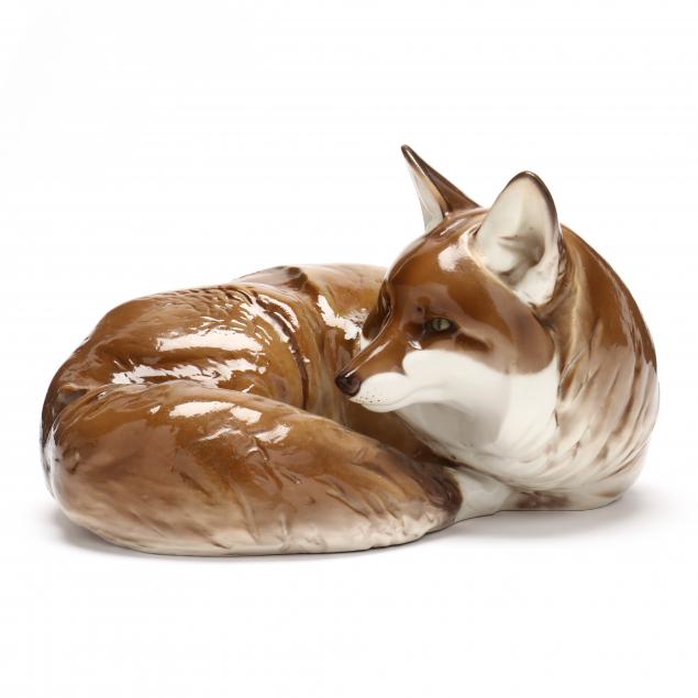 Germany, first quarter 20th century, hand-painted underglaze, modeled in a curled sleeping position yet fully alert, designed by Theodor Kaemer. Underside impressed with somewhat indistinct Nymphenburg shield mark.