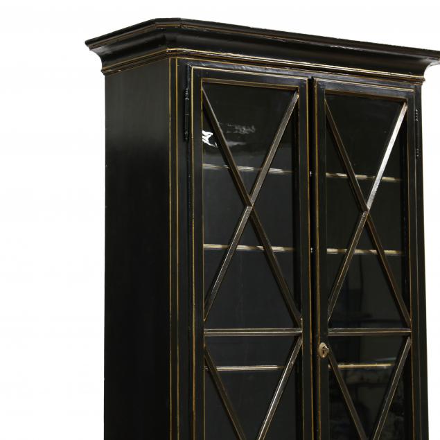 19th century upper cabinet with an associated custom base, two part form, upper cabinet with a cove molded cornice, two hinged doors with individual paned panels, louvered shelf interior, set on a base with applied conforming trim, two hinged paneled doors, molded base on turned feet, gilt highlights throughout.