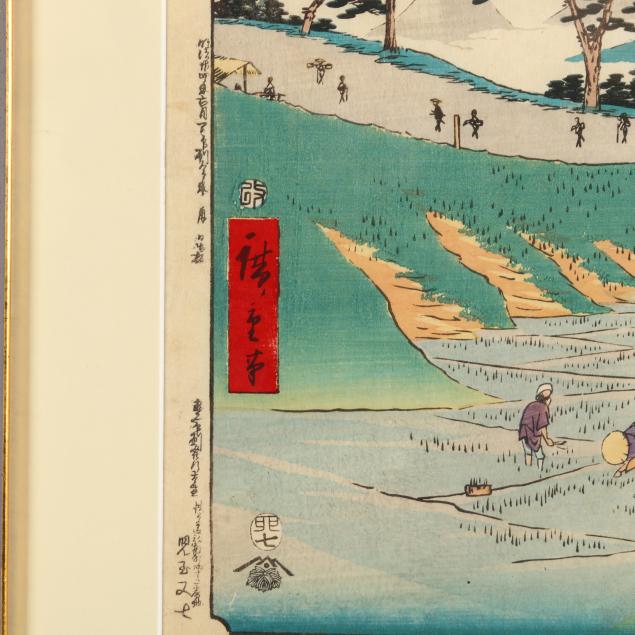 Possibly later edition of the circa 1855 series "Fifty Three Stations of the Tokaido Road," often referred to as the "Upright Tokaido" series, includes sixth station of