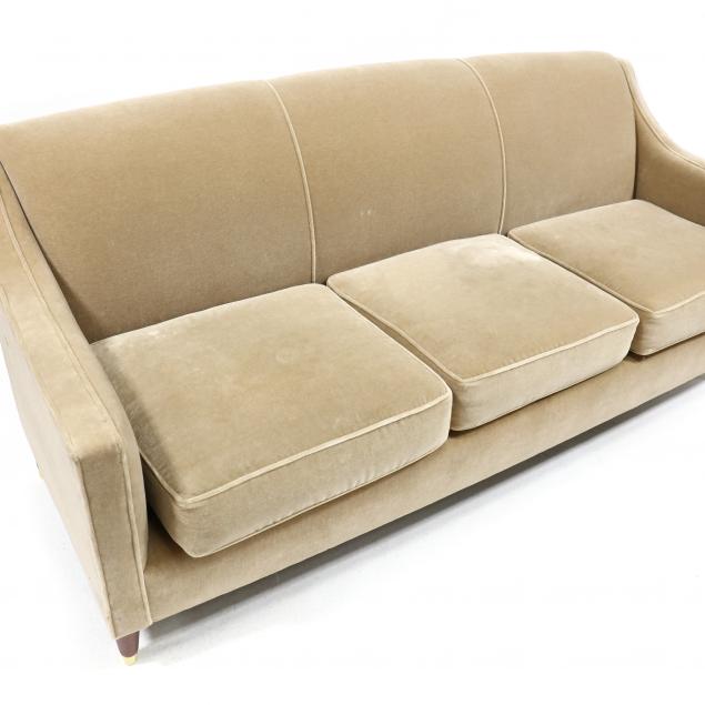 Tan mohair style upholstery with three loose cushions on turned wood legs with brass cap feet, appears unmarked.