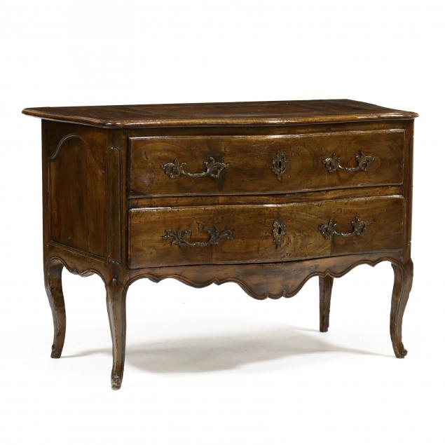 18th century, pine secondary, top with molded edge and with inset panels to frame surround, two conforming lipped drawers, raised panel corners, molded panel sides, molded and scalloped skirt, raised on tall cabriole legs with whorl feet.
