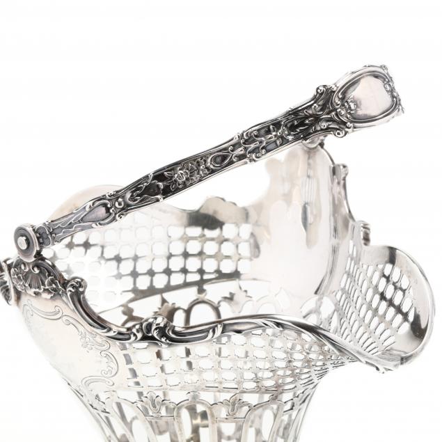 Early 20th century, model number A4109, with swing handle, the body featuring a boldly flared rim with cutwork diaper motif above a tapering waist with linear cutwork design, all raised on an oval base on openwork bracket feet, no monogram.