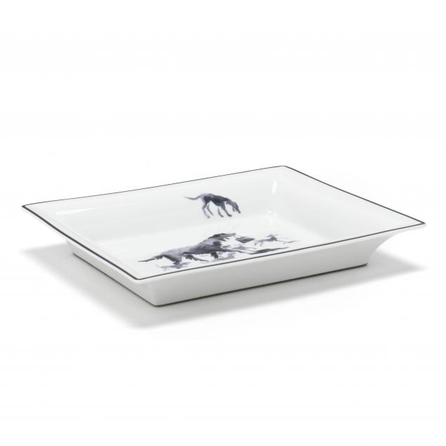 Rectangular dish of white porcelain painted in gradient shades of gray with a setter carrying a Kelly handbag, the bottom is lined with felt and marked in gilt letters "Hermes Paris H".