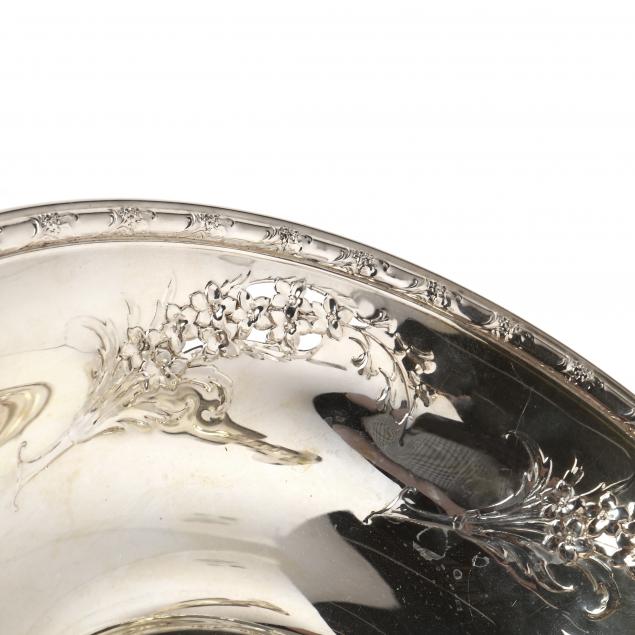 The first a sterling silver bon bon bowl with Neoclassical motifs, no monogram (1 3/4 x 6 1/2 x 5 in.) (slight mis-shaping to one handle); the second a sterling silver bowl by Wallace with delicate floral design, no monogram (2 x 10 1/2 in. diameter); and the third a tall sterling silver vase, unmarked, engraved floral decoration to urn form standard, no monogram (14 in.) (denting to body; with deteriorating composite material to inside of base).