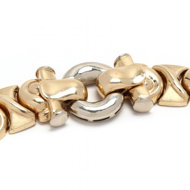 Necklace designed with alternating pinched and swirl links in polished and brushed yellow gold, completed with a white gold ring clasp, stamped 14Kt Italy.