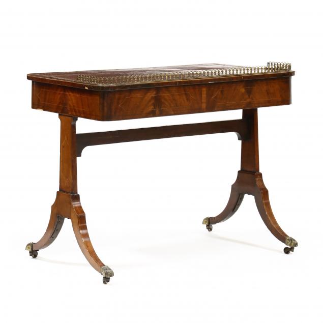 Early 19th century, mahogany veneer with light wood inlay, pine secondary, rectangular top with pierced brass gallery, rounded corners, inset brown leather surface, two flush drawers with line inlay, inlaid panel stiles on down-swept legs with repeating inlays, brass paw feet on casters, finished on all sides.