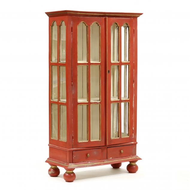Late 20th century, one part form, all over red paint with gilt highlights, two hinged doors with six window lights each, white painted shelved interior, glazed panel sides, two lower drawers on bold turned wood feet.