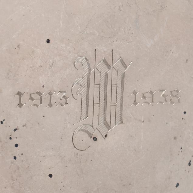 The first an International bread dish, pattern J41, monogrammed "PWW;" the second a Wallace cake plate, pattern number 2367-3, decorative cutwork to rim; the third a Gorham cake plate with period script monogram "MMcH," pattern number A6956; the fourth a square cake plate by Whiting, pattern number 4242 (some mis-shaping and pinpoint denting); and the fifth a shallow serving bowl by Towle, pattern number 66183, engraved "1913 W 1938" to well (11 3/4 in. diameter).