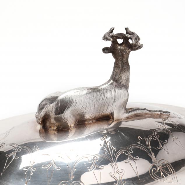 Second half of the 19th century, unknown manufacturer, marked "185 / 4," of oval form raised on four stag legs with hoof feet, the handles modeled as stag heads, the domed cover with reclining stag as finial, engraved decoration to body and cover, no monogram.