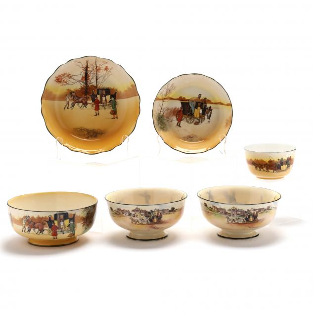 Early to mid 20th century, transfer decorated with hand coloring including pitcher and basin, (12) various plates (10.5 in. diameter), biscuit jar, cream pitchers, teapot, serving bowls, cups, saucers and soup bowls, marked.