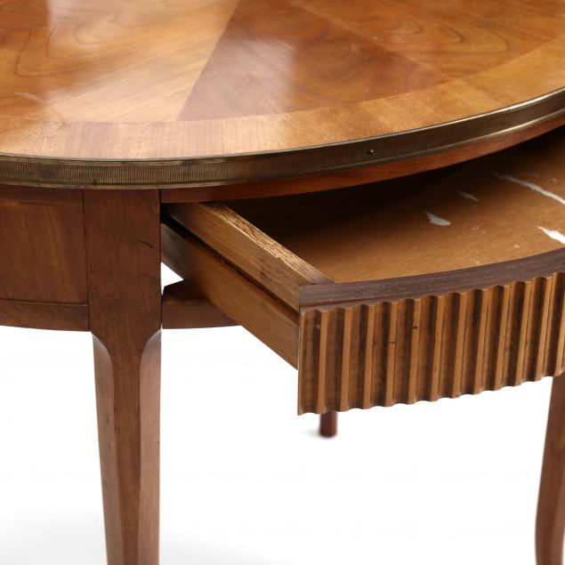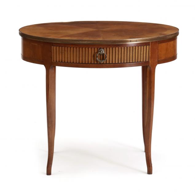 Late 20th century, cherry veneer, oval top with book-matched veneers and banded edge, ormolu trim, single fluted drawer on cabriole legs, unmarked.