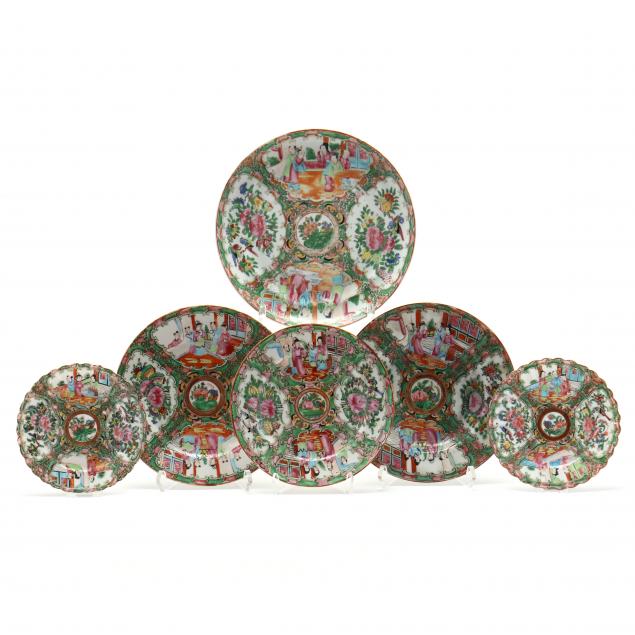 Including a pair of bread plates, circa 1900 (6 in. diameter); a dinner plate, 19th century (9 3/4 in.); a dessert plate, circa 1900 (8 1/2 in.); a rimmed soup bowl marked "Made in China," circa 1920 (8 1/2 in.); and a salad plate marked "China," early 20th century (7 5/8 in.).
