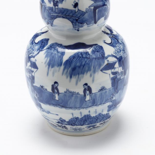 19th century, double gourd shaped porcelain vase hand painted in underglaze blue with a continuous lush landscape with pavilions and figures, a band of floral decoration around the rim and above the foot, four character Kangxi mark to underside.