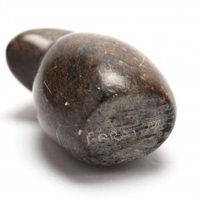 20th century, the tallest a hand-carved African portrait comb, mounted atop a wood and metal stand (9 in.); two small carved hardstone figures, likely African Shona or Indonesian, both with hand written numbered labels to underside (5 1/2 in. tallest).