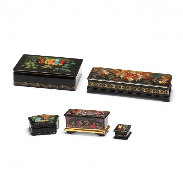 Second half 20th century, each exterior hand-painted with traditional figural designs and gilt decoration over black, including a long box with elaborate equestrian allegorical narrative, marked Made in Russia to underside (1 1/2 x 3 1/2 x 8 1/2 in.); rectangular box with eight figures within a forest, inscribed and dated in Cyrillic to edge (2 x 5 x 7 in.); a shaped small box with two figures before a castle, inscribed and dated in Cyrillic to edge (1 1/2 x 3 x 3 1/2 in.); the smallest box inscribed to lid border with worn mark to underside (1 x 1 5/8 x 2 in.). Also included is a porcelain music box painted with festive and dancing figures in an interior, marked to underside (2 1/2 x 5 x 2 1/4 in.).