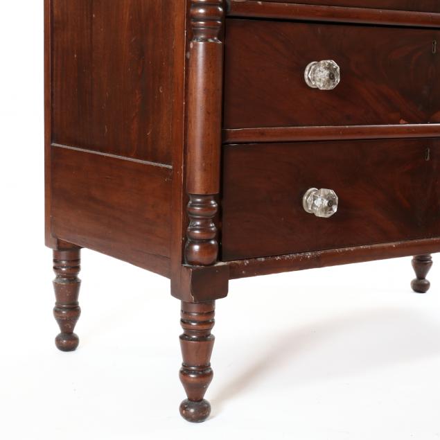 Circa 1840, mahogany veneer, white pine secondary, rectangular to with applied vertical banded veneer at edge, large projecting upper drawer above three recessed graduated drawers flanked by turned half columns applied to the stile, paneled sides, turned feet.