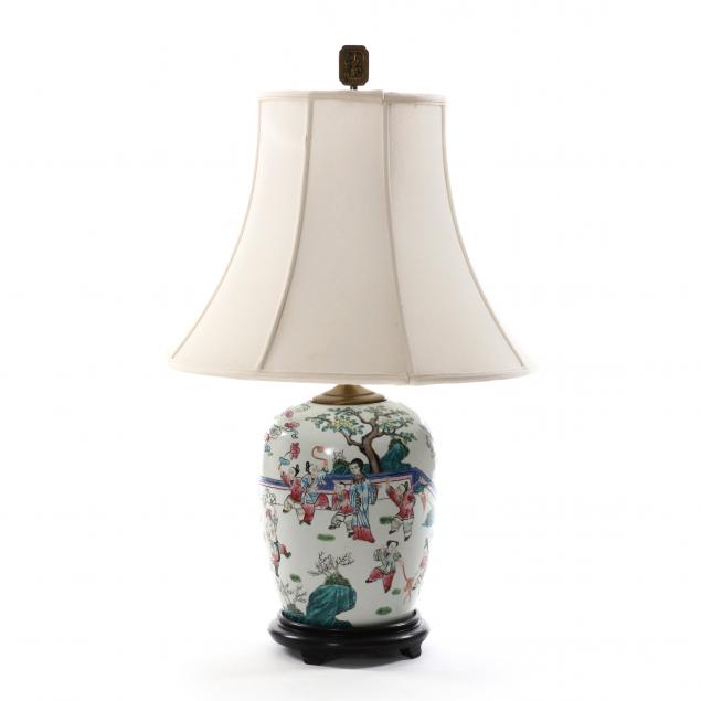 Late 20th century, hand-painted porcelain decorated with children in a courtyard, wood base, with tapered shade.