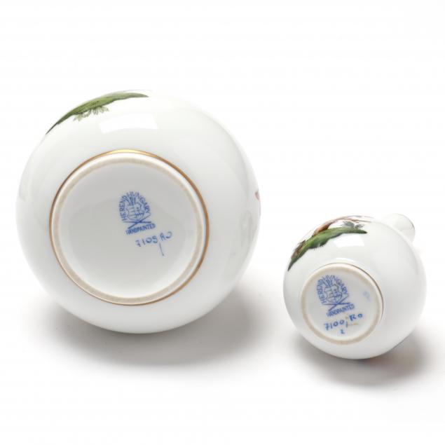 20th century, (14) pieces including: (3) cache pots, model number 7302 (3 x 4 in. diameter); an ashtray, model number 7760; (2) graduated bud vases; a set of four salt & pepper shakers; a butter dish with cover, model number 389; a soup cup and saucer, model number 1700 (3 1/4 in.); a four piece hors d'oeuvres set, model numbers 443 and 525 (10 in.); and a Herend retail plaque. All marked.