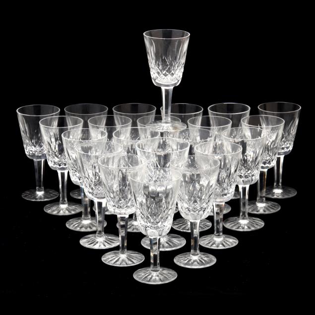 Ireland, including (21) white wine stems (5 1/2 in.); a single claret wine stem (5 7/8 in.); (8) water goblets (6 7/8 in.). All marked.