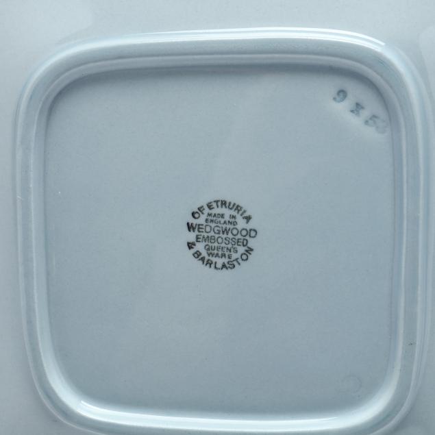 Cream color on lavender with shell edge, all marked, including: (12) dinner plates (10 1/8 in.); (1) dinner plate (10 1/2 in.); (11) salad plates (8 1/8 in.); (13) square luncheon plates (8 3/4 in.); (13) cream soup bowls and (13) saucers; (13) footed cups and (13) saucers; (11) bread plates; (2) square handled cake plates (10 1/2 x 9 in.); (2) circular platters / chop plates (12 3/4 in.); teapot; coffee pot; sugar bowl with cover; and creamer.