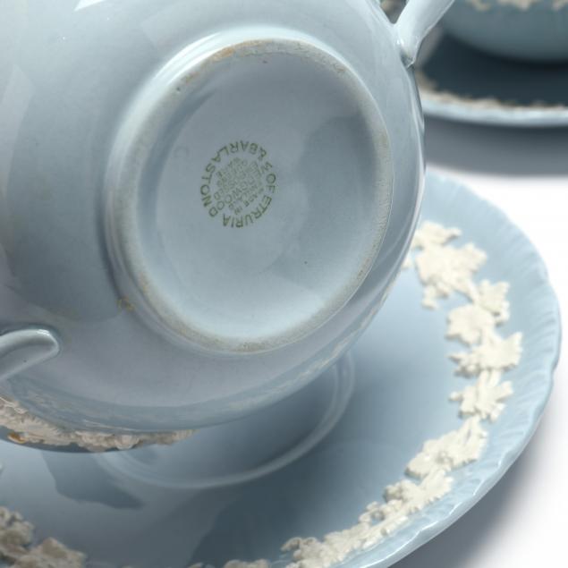 (1) salad plate with chip to rim; (1) salad plate with small area of discoloration to creamware; (1) soup bowl with repaired break to one handle; (2) soups with chip to rim; (1) bread plate with chip to underside of rim; (1) bread plate with small area of discoloration to creamware; creamer with chip to spout.
