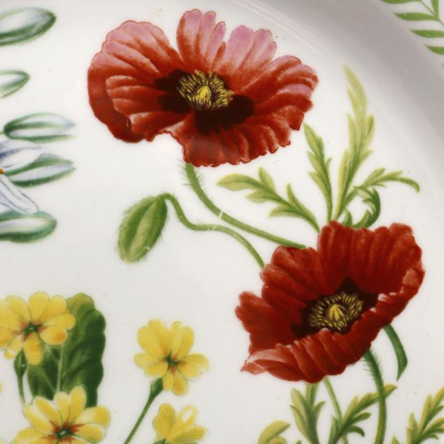 Each piece featuring a design of spring flowers within a wreath of laurel, includes: nine (9) plates (10 1/2 in.), seven (7) luncheon plates (9 1/4 in.), nine (9) bread & butter plates, eight (8) cream soup bowls and eight (8) saucers, nine (9) footed cups with four (4) saucers (6 in), eight (8) espresso cups with four (4) saucers (5 1/4 in), a round (12 in.) platter, an oval (15 in.) platter, a covered tureen, an open serving dish, a coffee pot (9 in.), a tea pot, a covered sugar, and cream jug.
