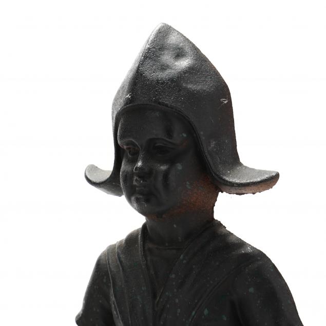 Late 20th century, including a black painted iron dutch girl, and a painted iron thatched roof cottage, unmarked.