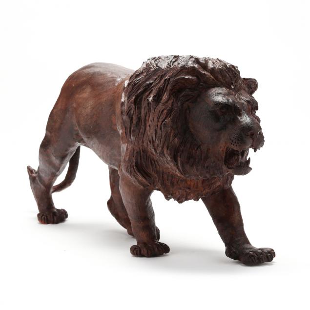 20th century, a detailed carving of a lion in stride with mouth open, carved signature to underside.