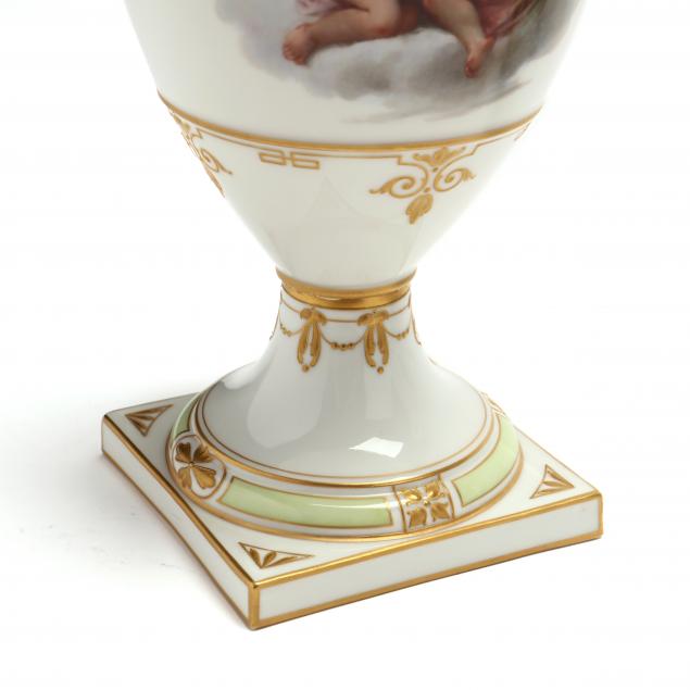A KPM Berlin mantel vase, circa 1840, painted with putti and flowers, applied dragon form handles, gilt swags and other details, scepter and orb underside mark (10 1/4 in.) (break and loss to one dragon beak); a 20th century Limoges center bowl by A. Raynaud, blue printed mark (3 1/4 x 9 1/2 in.); a pair of dessert plates hand-painted with floral clusters, late 19th century probably French (9 1/4 in.) (a few faint cutlery marks).