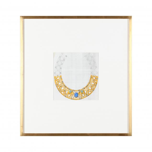 Mixed media on blue paper, unsigned, circa 1950s, each work featuring designs for a collar or choker necklace, presented in uniform matting and framing under glass.