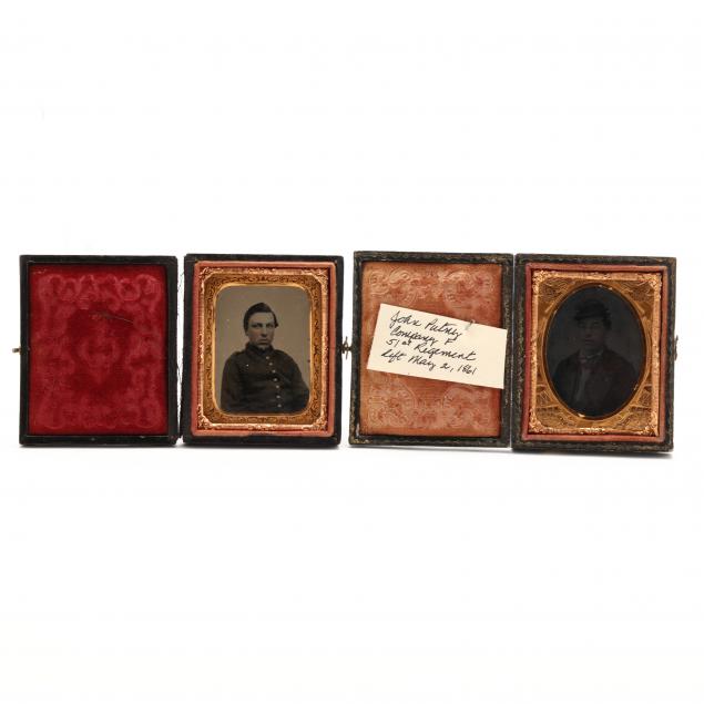 To include: three ambrotypes, the first being a Union image having "John Pultney Company "F" 51st Regiment Left May 2 1861 penned behind the portrait with the same on a note pinned to the inside cover; the second being a likely unidentified Confederate in shell jacket; the third in half case with an 1880s druggist's receipt behind the image; the fourth an unidentified tintype with a non-descript Union soldier.