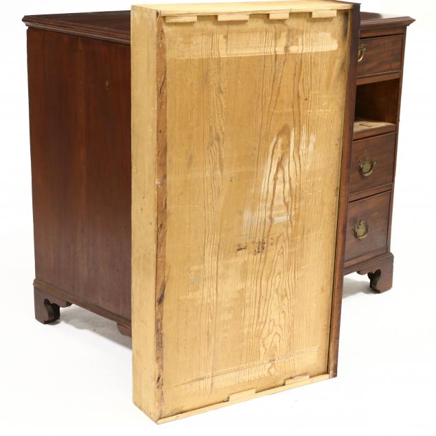 It is possible that three of the foot facings are original and the back left appears replaced; several of the brace blocks are later and the bracket facings are hand cut but now have round head nails attaching them; later pulls with some plug holes; cut/patch near escutcheons; drawer runners rebuilt.