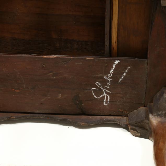 Mid 18th century, oak and pine secondary, top with molded edge and notched corners, three side by side lipped drawers above two small drawers, bold scalloped central skirt, canted corners, cabriole legs with shell carved knee, ball and claw feet.