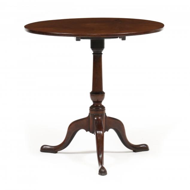 Mid 18th century, circular top with batten and block support, ring and urn turned standard, tripod base with raised snake pad feet.
